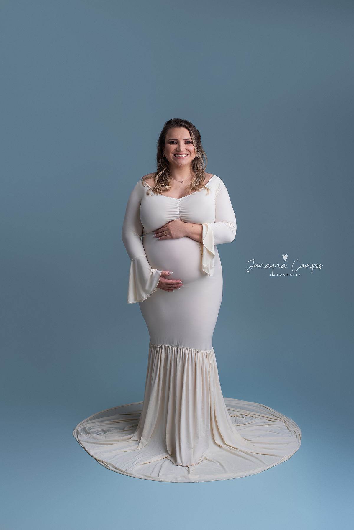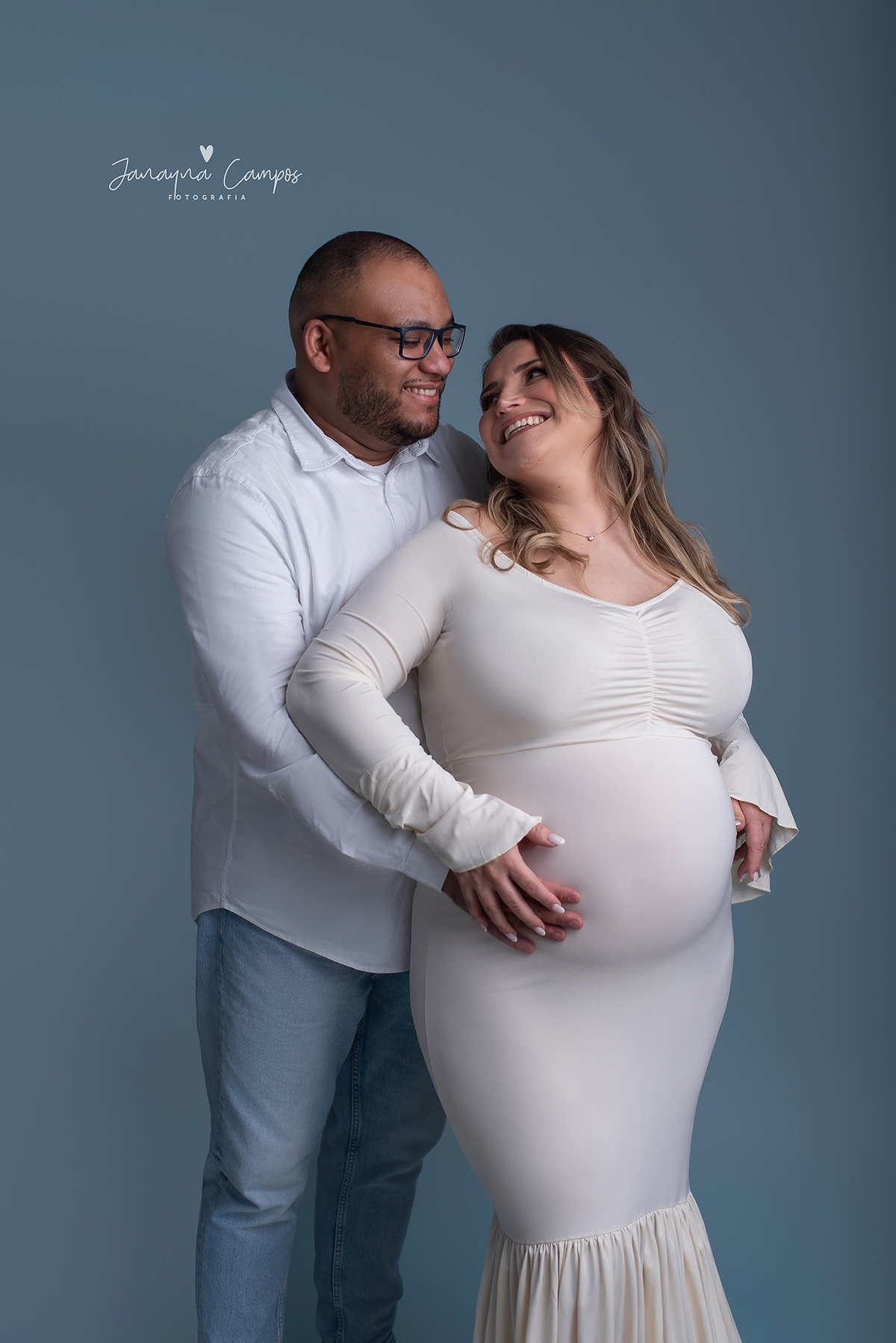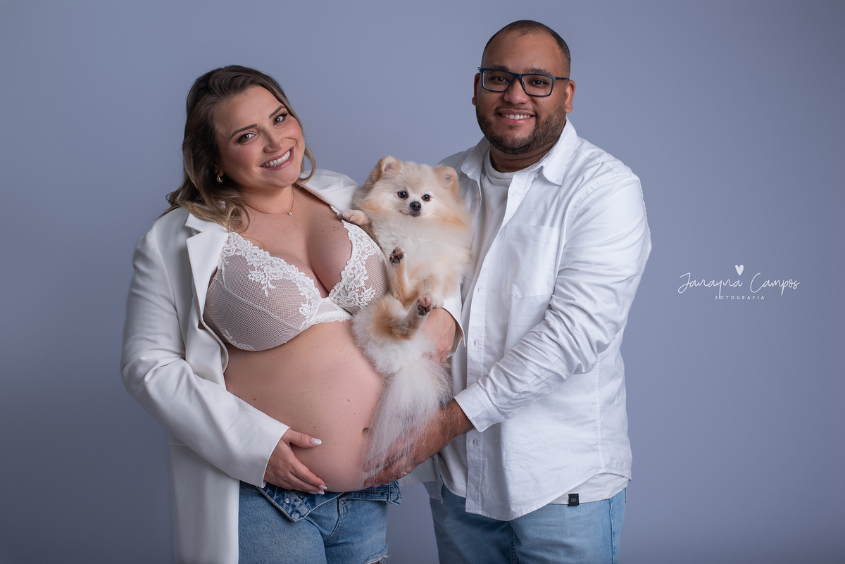 Sessão fotográfica de gestante em estúdio com participação do pet.
