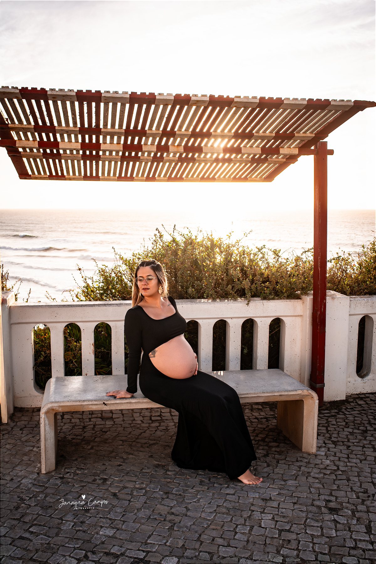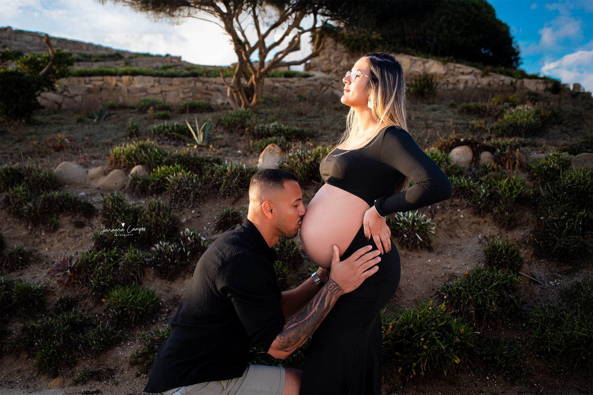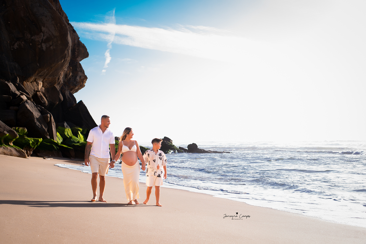 Sessão gestante na Praia de Santa Cruz com estilo minimalista e luz natural, captando a autenticidade e a serenidade da mamã.