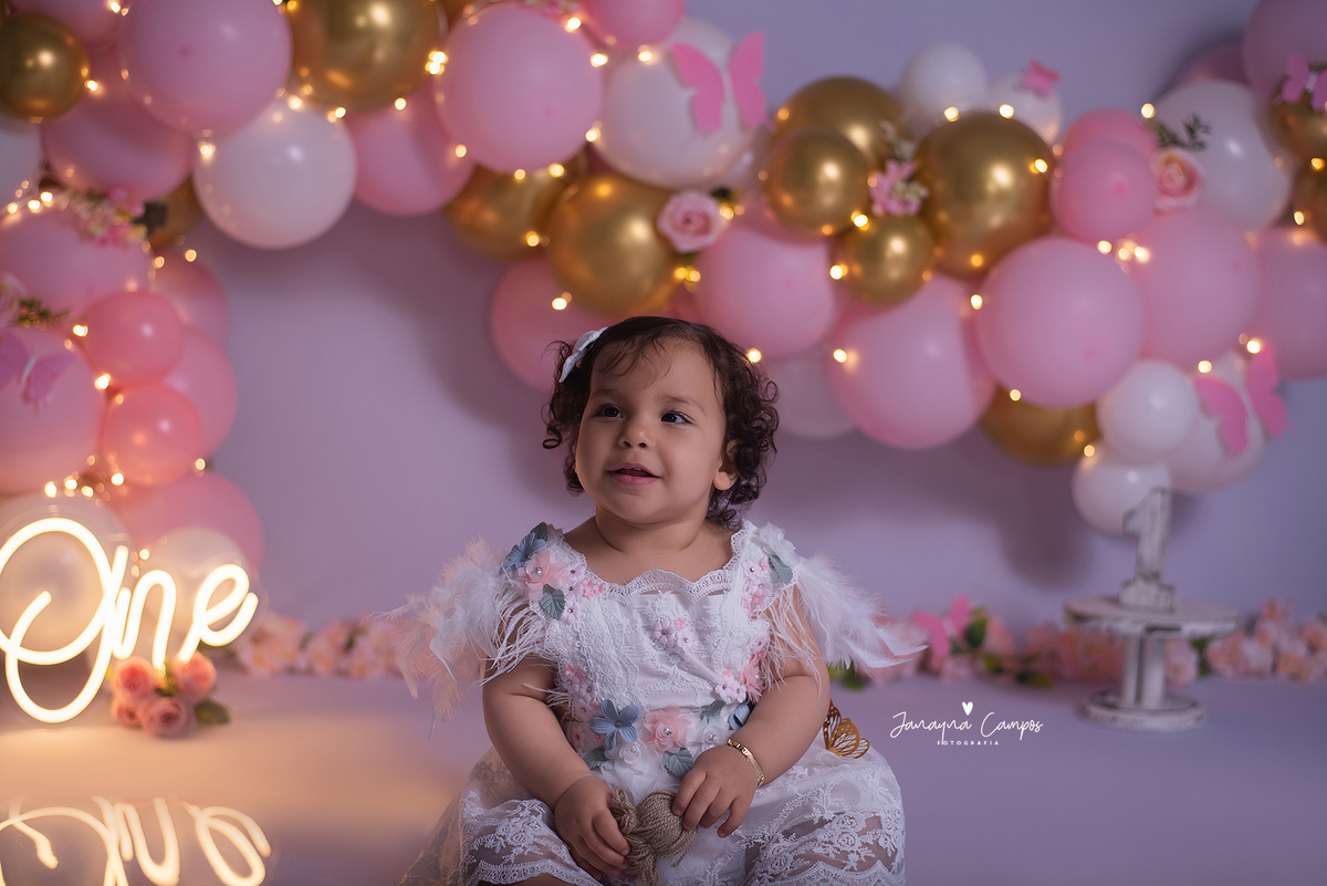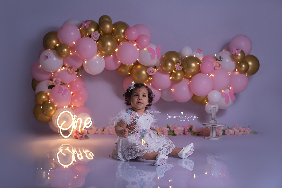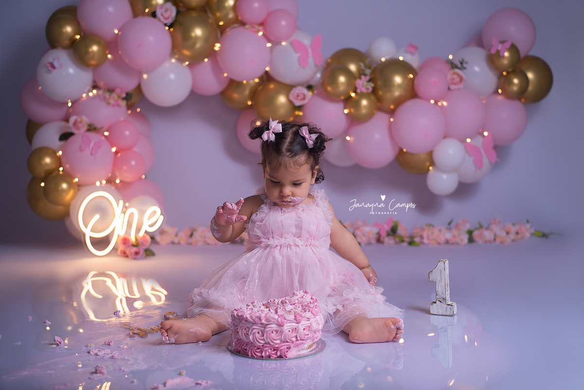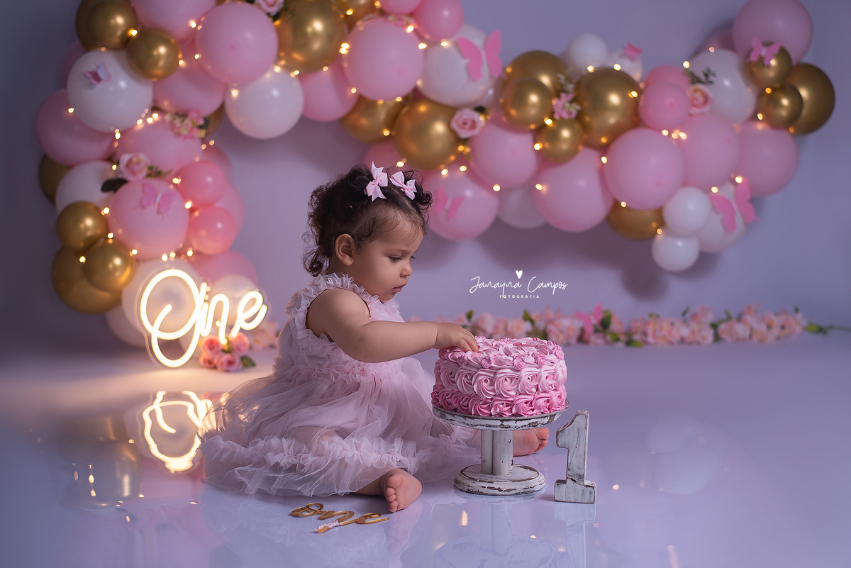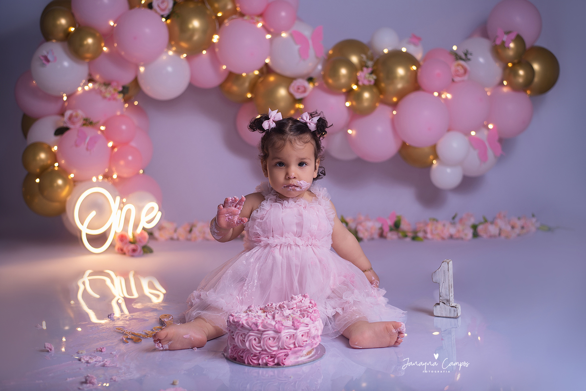 Sessão de fotos infantil com bolo.