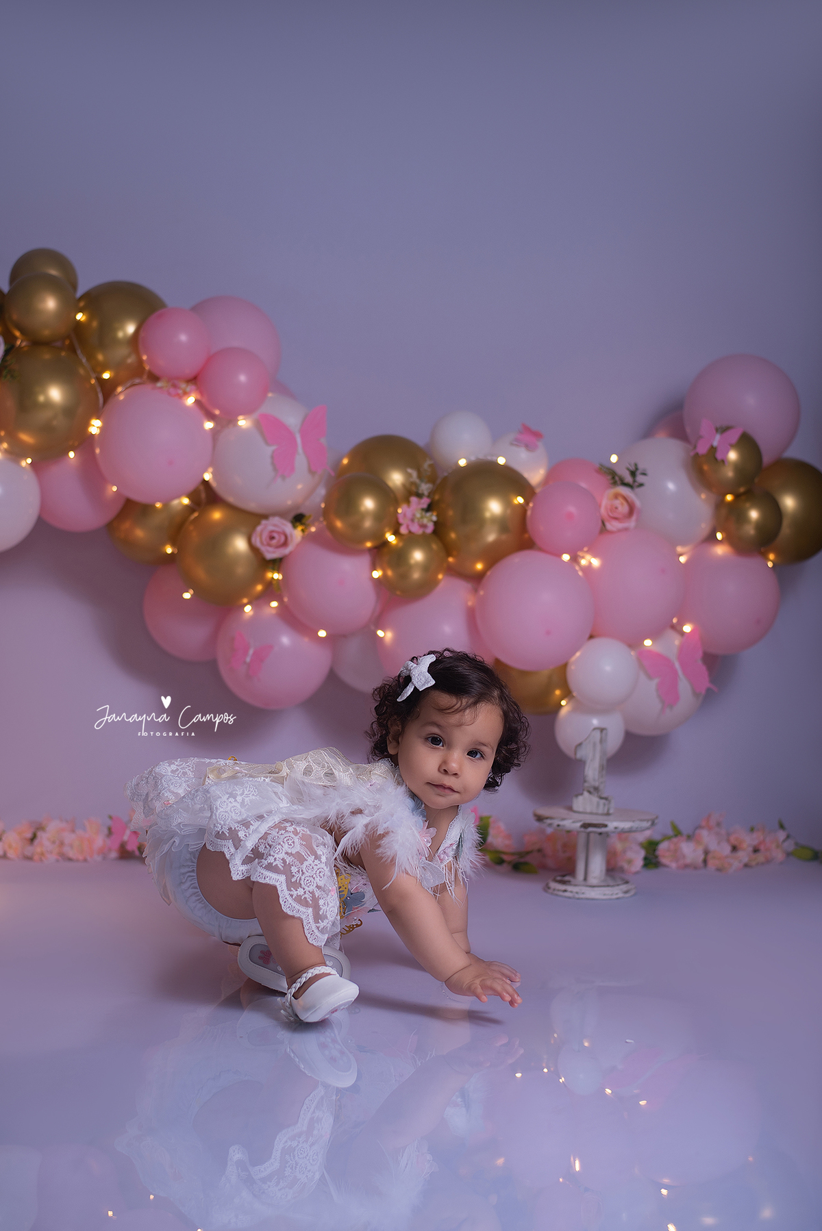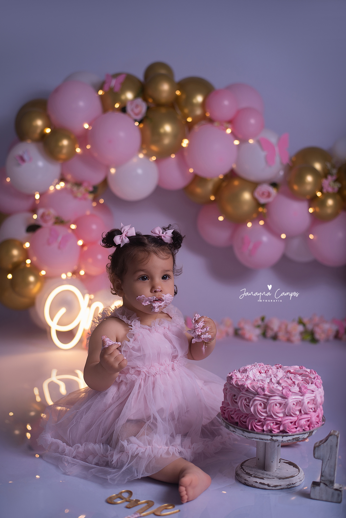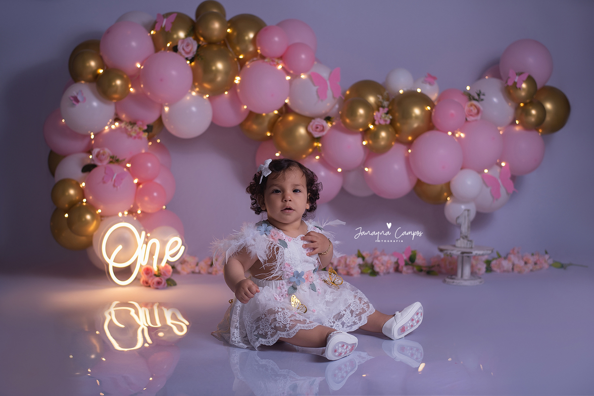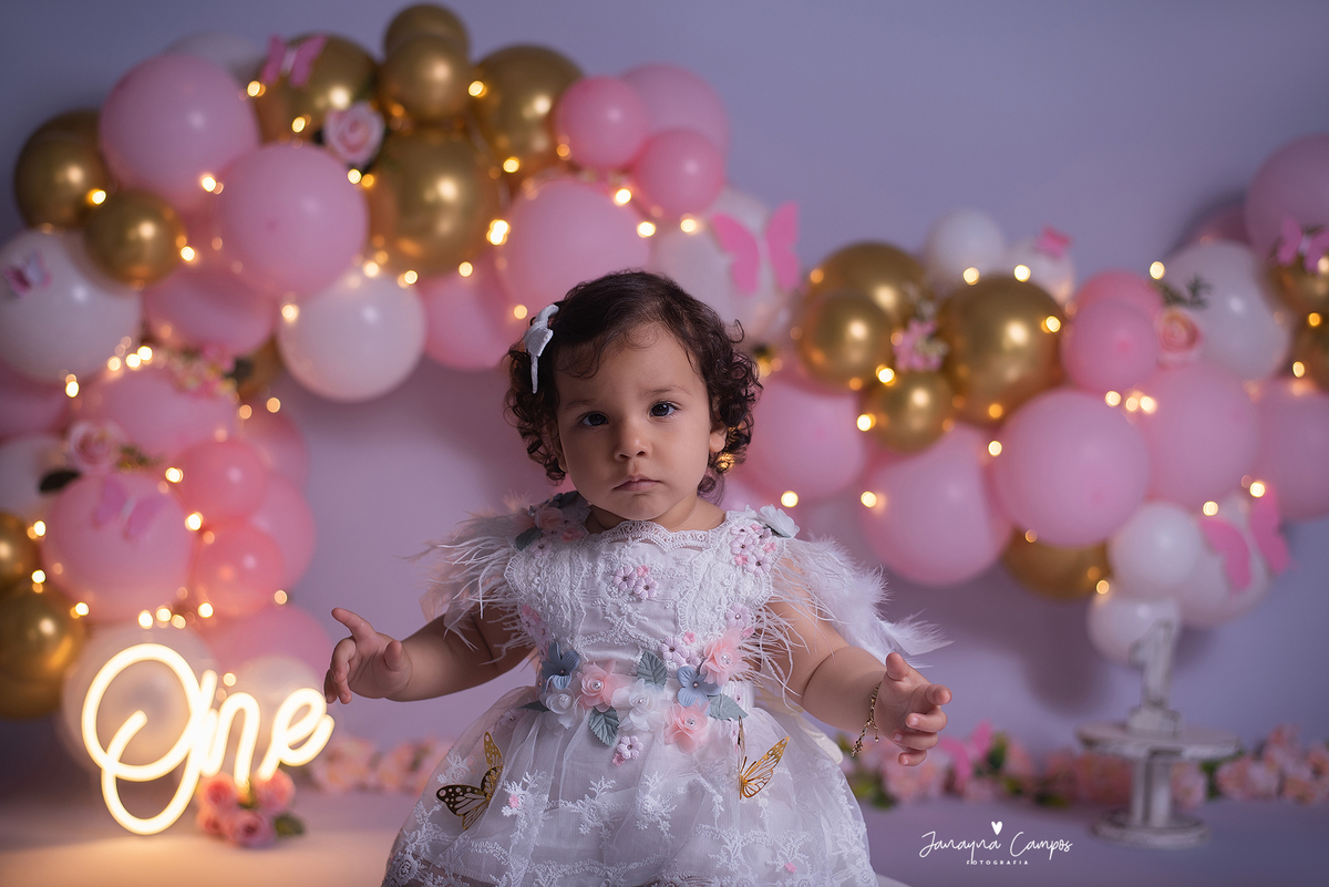 Sessão de fotos infantil com bolo.